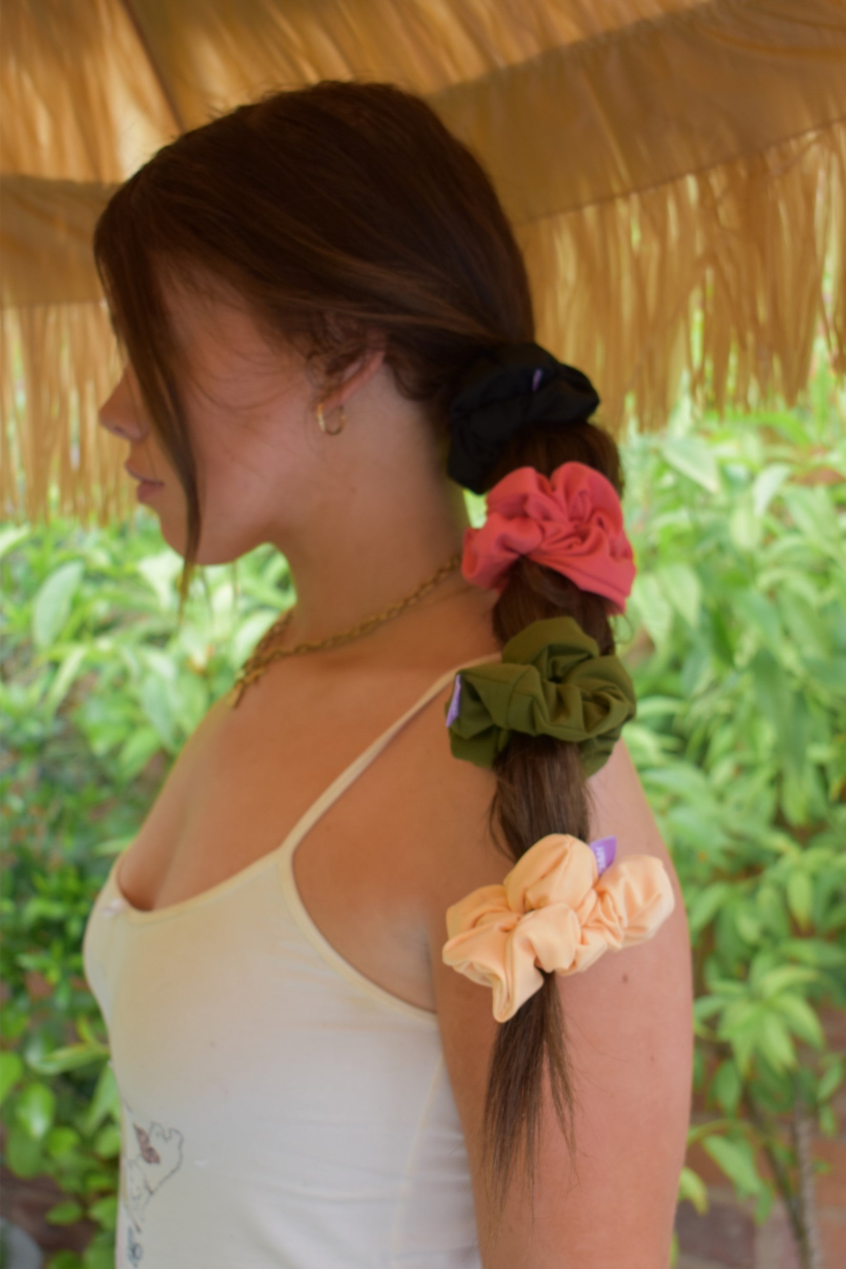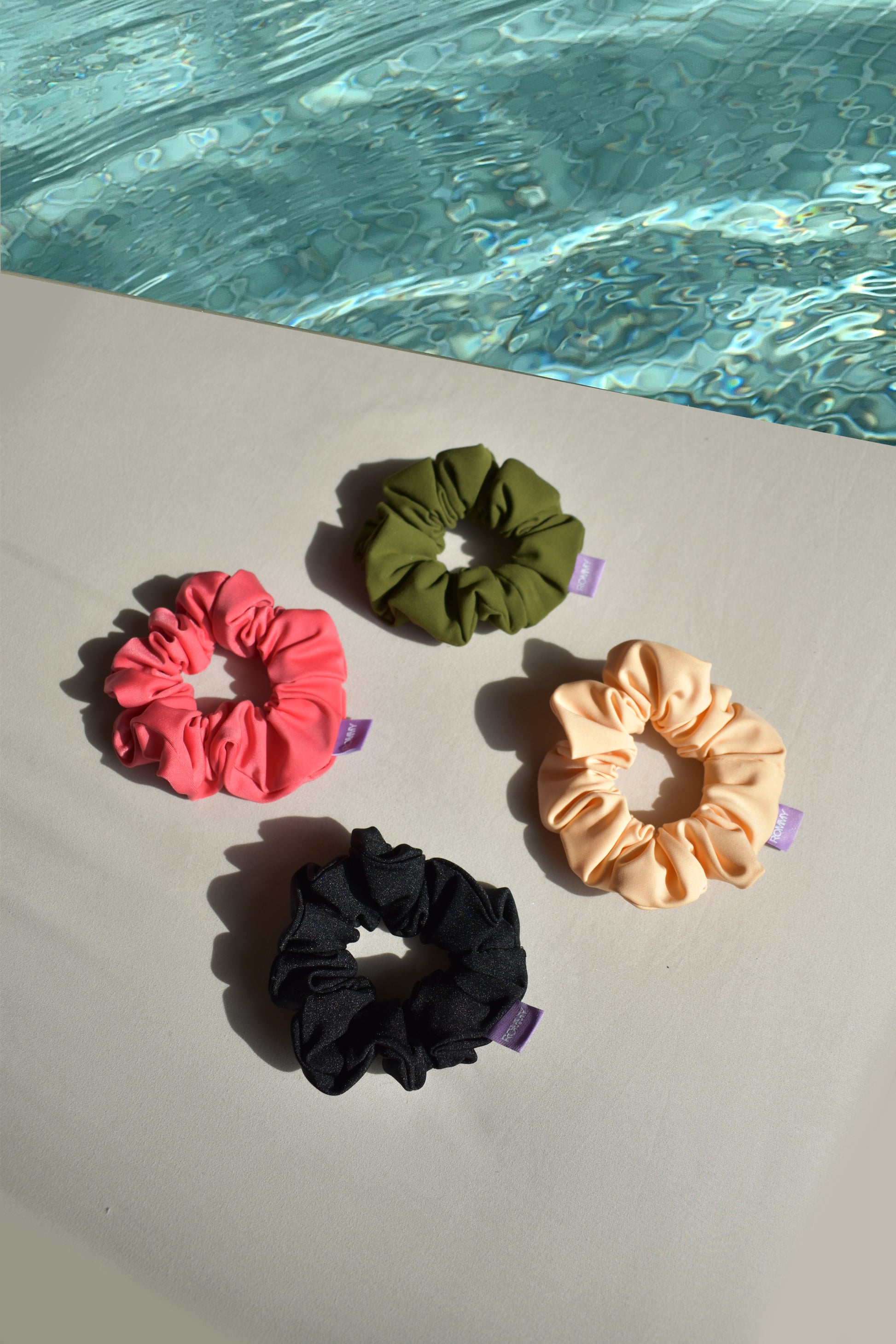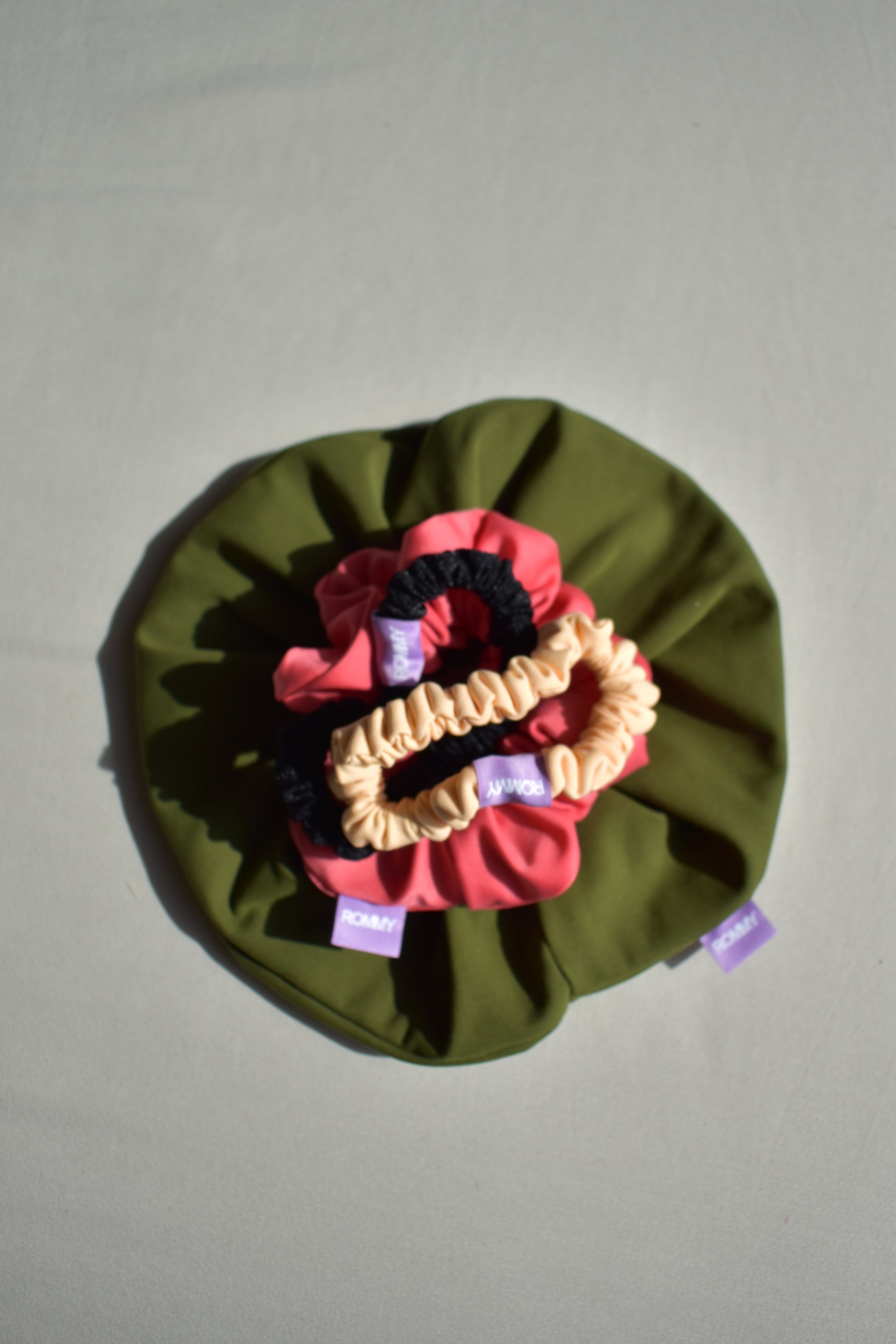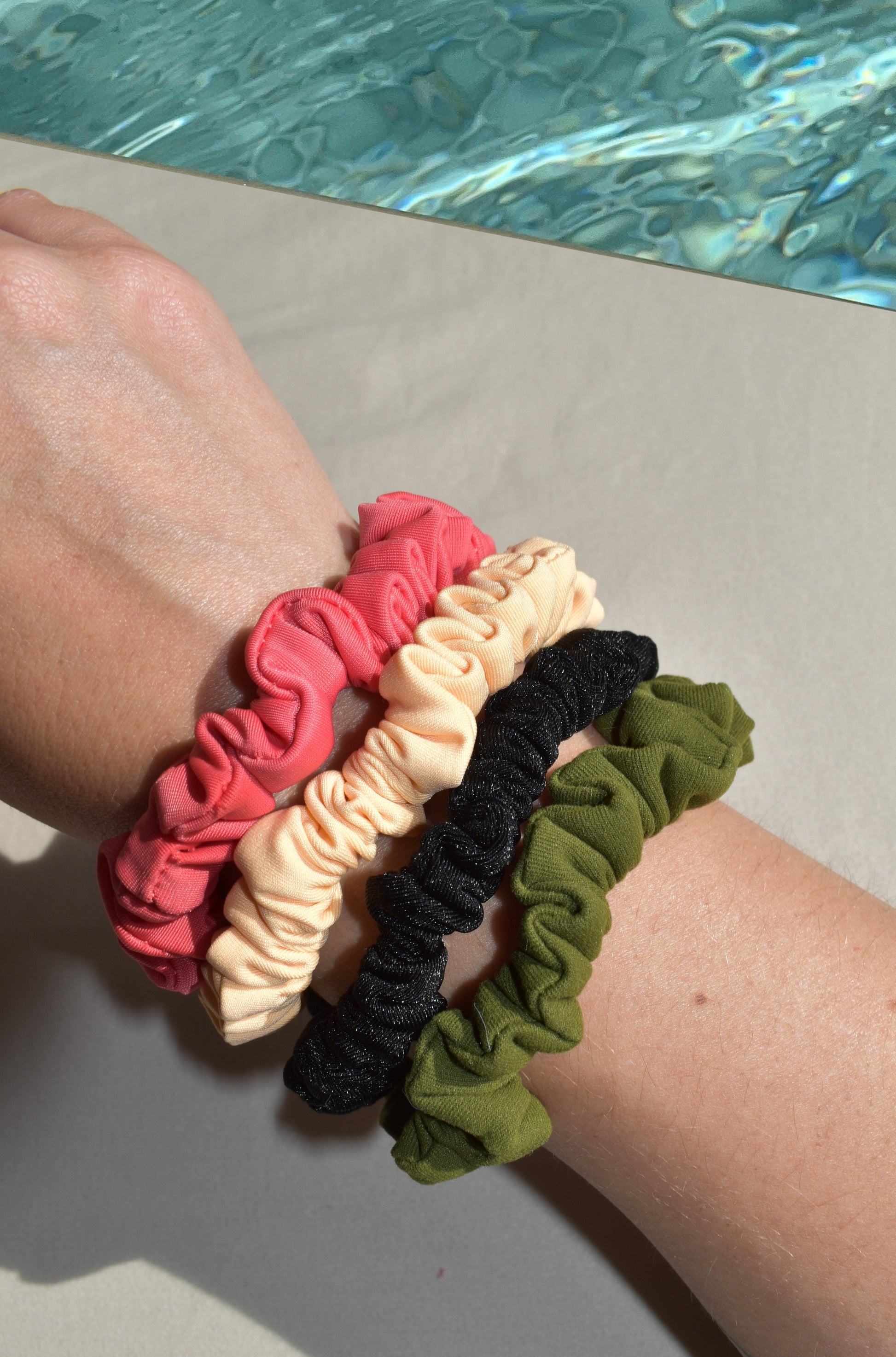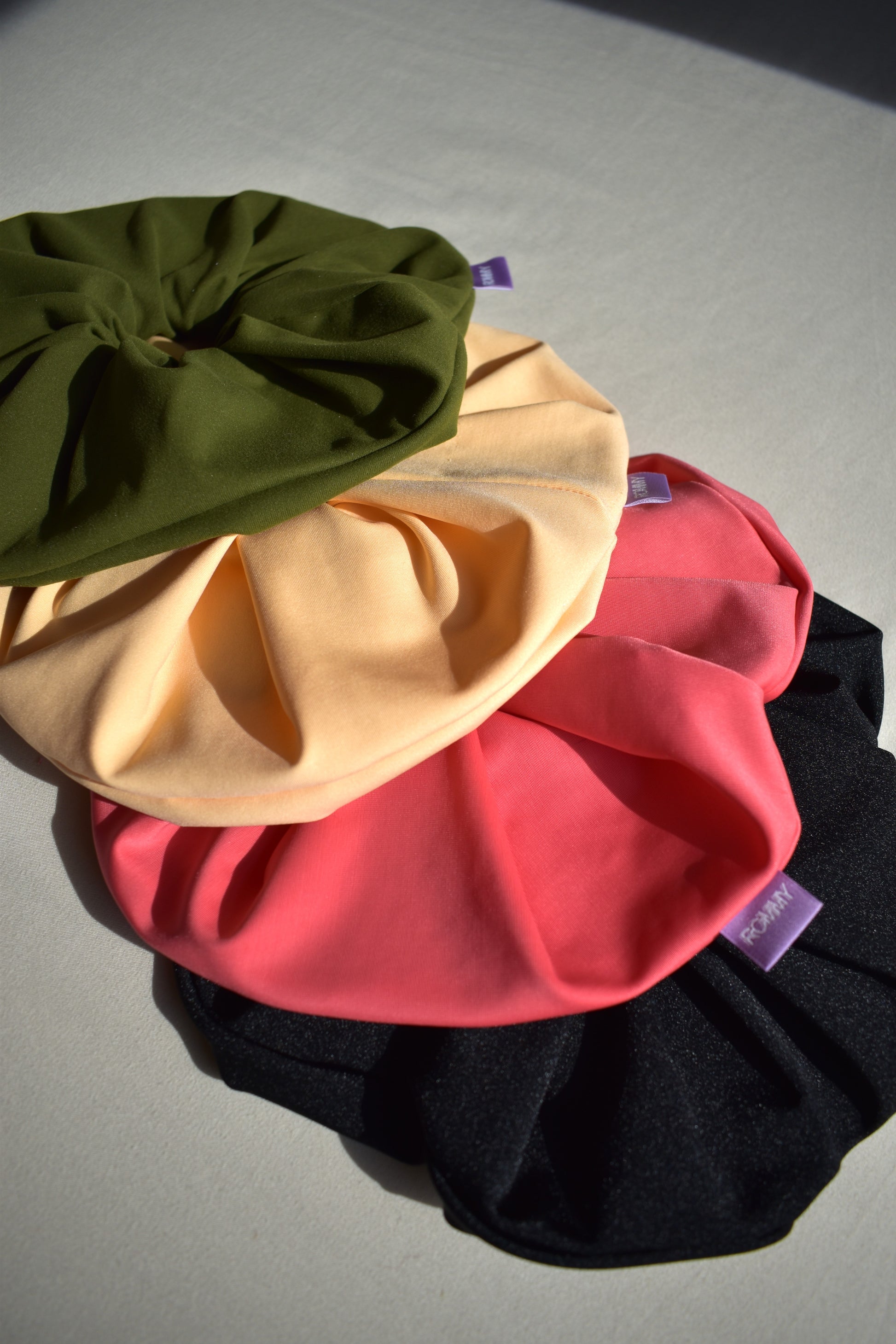 - 4 Pack of scrunchies in same or mixed random sizes: Khaki, Apricot, Black & Rasberry